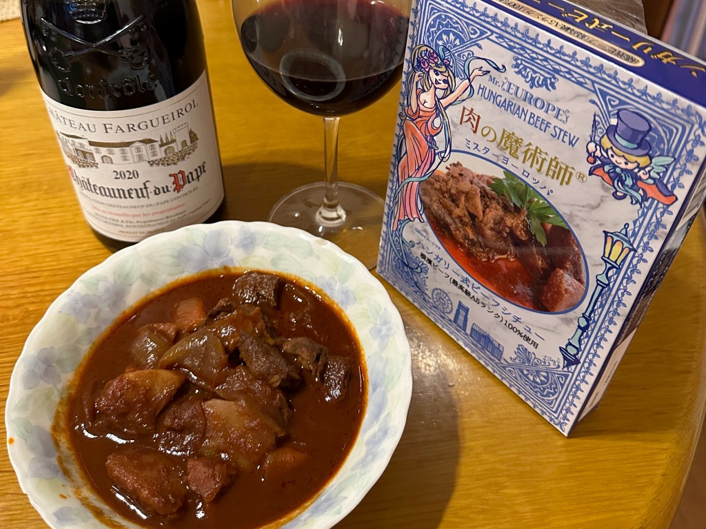 ↓昔お世話になった横浜馬車道の肉バル(現在は閉店)の店主の肉の魔術師こと若林さんがプロデュースしているレトルトのグーラッシュ(ハンガリー式ビーフシチュー)です。甘めのタンニンと良く合いました。お奨めです。