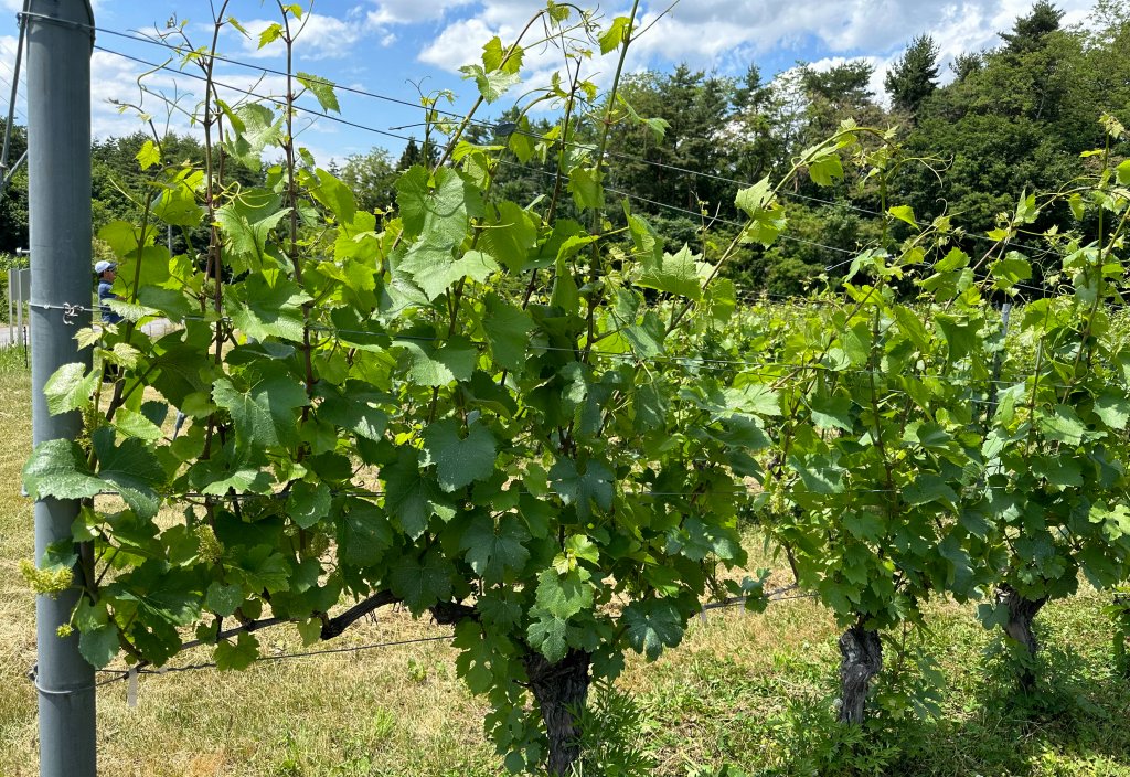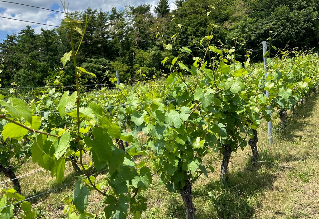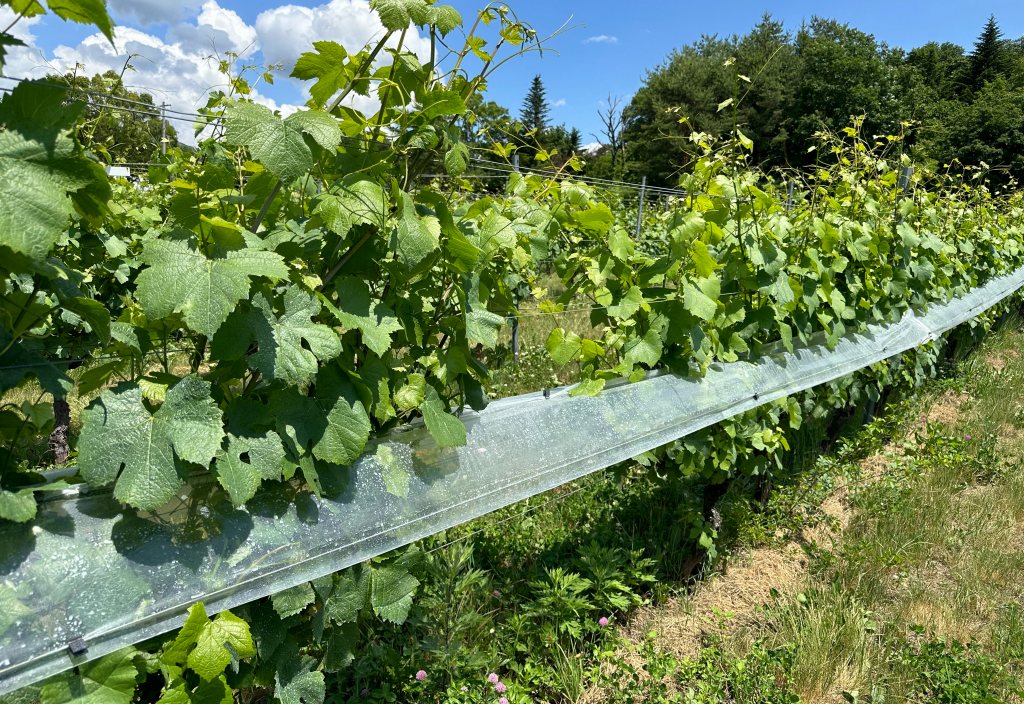下半分にビニールがかけられていますが、これが、下に成る実を雨から守るためのシートです。ピノノワールの果皮は薄い為に、雨が続くと果皮が破れてしまう為、このようなカバーで果実を守っているようです。