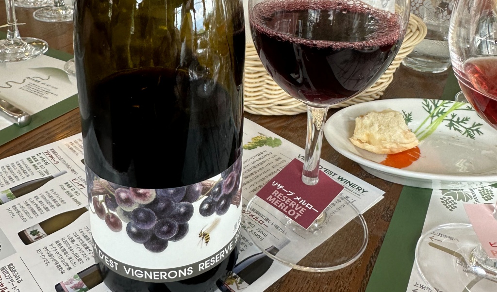 ↓ヴィニュロンズ・リザーブ・メルロー。ワイナリーの赤のフラッグシップです。樽熟1年半とのこと。柔らかさの中に、果実の厚みも感じられるとてもエレガントな赤です。