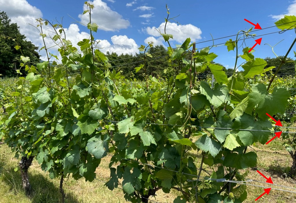 ↓欧州系品種で一般的な垣根仕立てです。このシャルドネの畑では、長梢剪定のギヨ・サンプルが採用されています。これは、冬の剪定で、主幹に近い前年度の結果枝を水平に誘引し、そこから数本のシュートを伸ばして結実させる仕立て方です。このワイナリーでは、短梢剪定のコルドン・ロワイヤもメルロー種で採用されているようです。