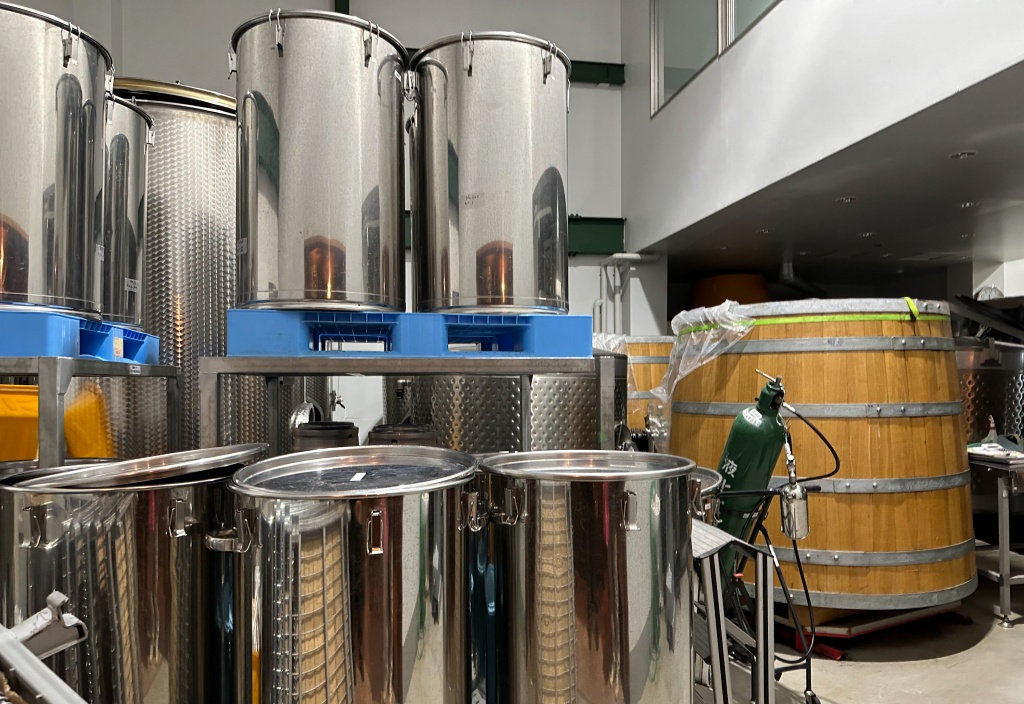 清潔なセラー内には、白ワイン用の4000Lのステンレスタンクと赤ワイン用の発酵用のオーク樽(2000L)が並んでおり、奥にはバリックが並んでいます。