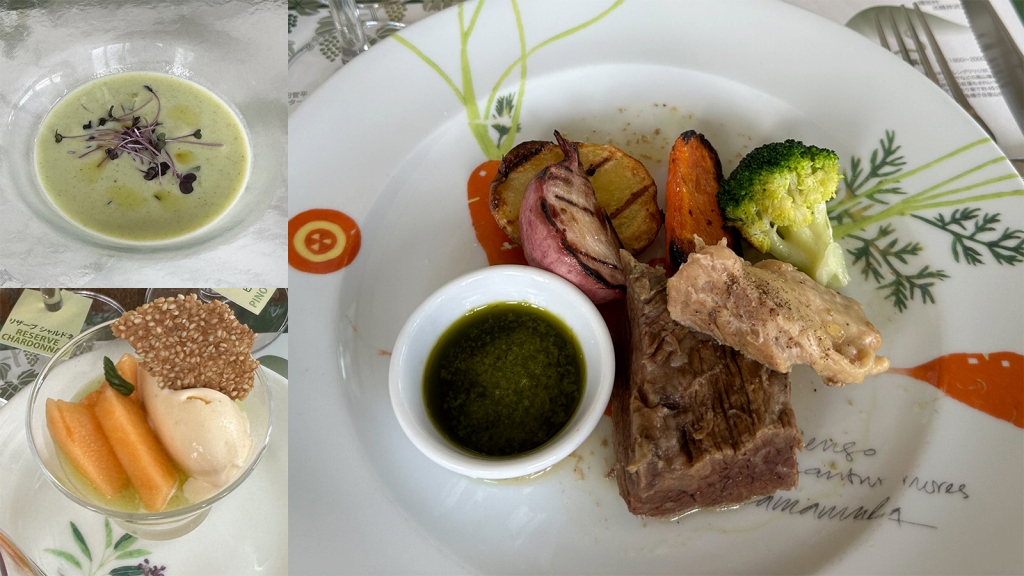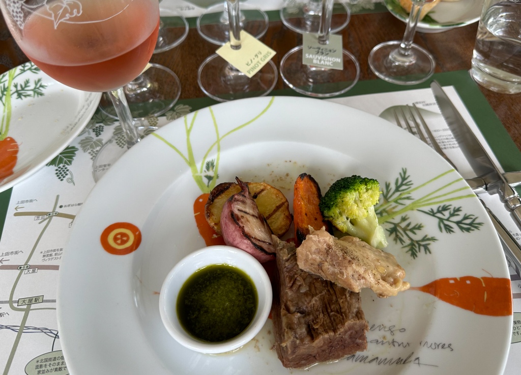 窓の外に北アルプスの雄大な山々を眺めながら、ワイナリーに付随するレストランとは思えないような素晴らしい料理を楽しめます。