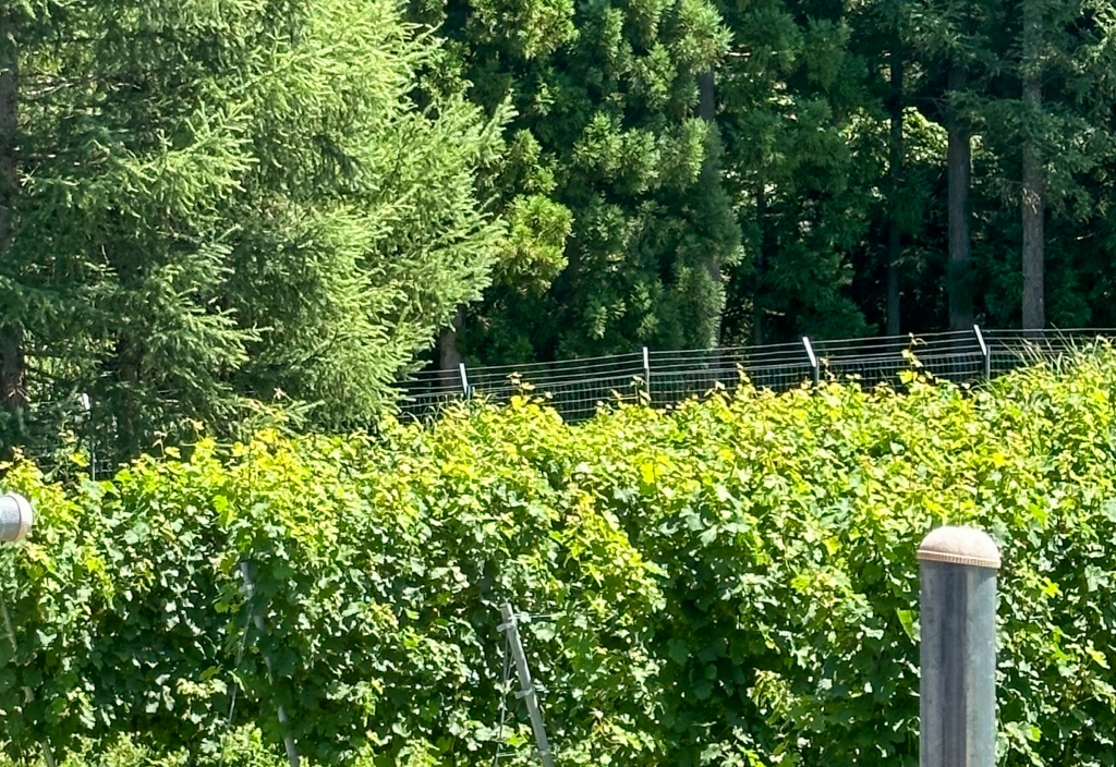 ↓ブドウ畑の周りには、電気柵が設置されています。イノシシや小動物に対する低い柵が26km、熊等への対策用の本電気柵が24mに渡って張りめぐらされているとのこと。(この地も、最近が熊の出没があるようです)
