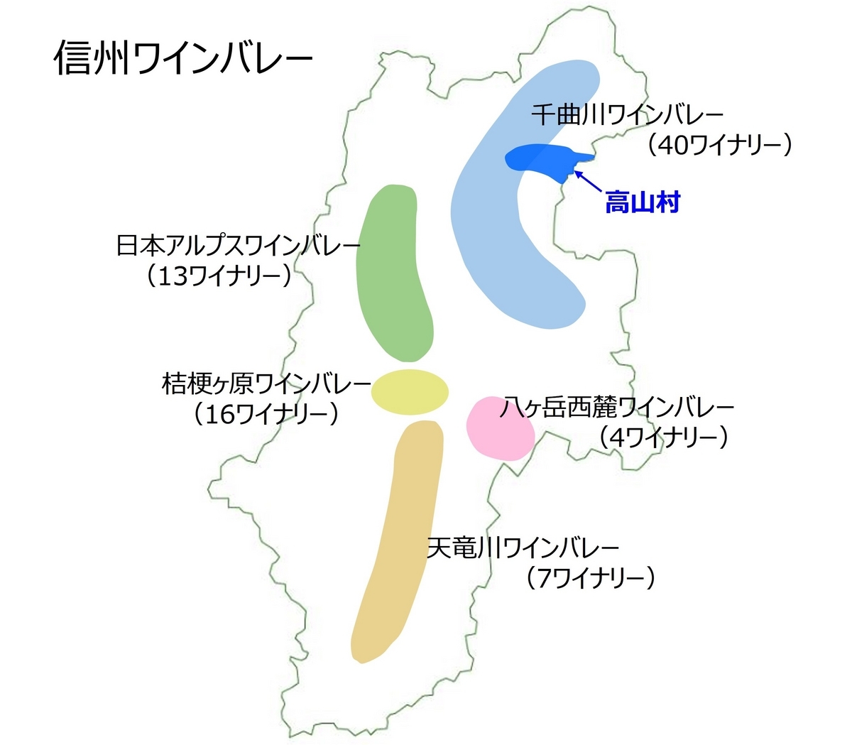 長野県のワイン産地は、2013年に発表された「信州ワインバレー構想」のもとで、5つの主要産地が定義されています。その中で一番多くのワイナリー(40軒)が集中しているのが「千曲川ワインバレー」で、高山村は、その中に含まれ、いわゆる「ワイン特区」のひとつに認定されています。
