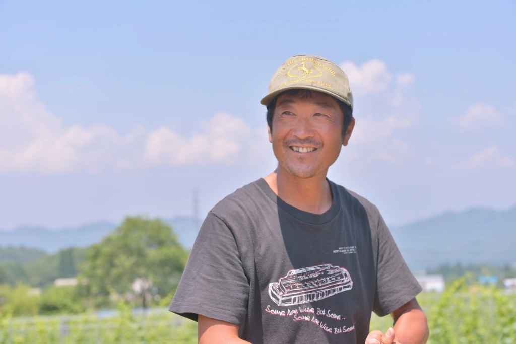 佐藤明夫さんは、シャトー・メルシャンの契約栽培家として、「北信シャルドネ」や「長野シャルドネ」、「北信ピノノワール」にぶどうを提供しています。