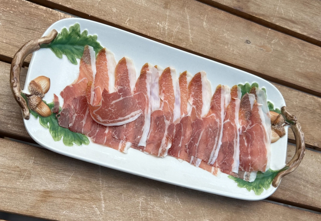 海外の生ハムは、海外への遠距離輸送を考慮して、塩分が強いものが多いのですが、こちらの生ハムは、塩分を最小限に抑えており、その分、脂の甘みや旨味がより感じられる素晴らしい味わいのものでした。
