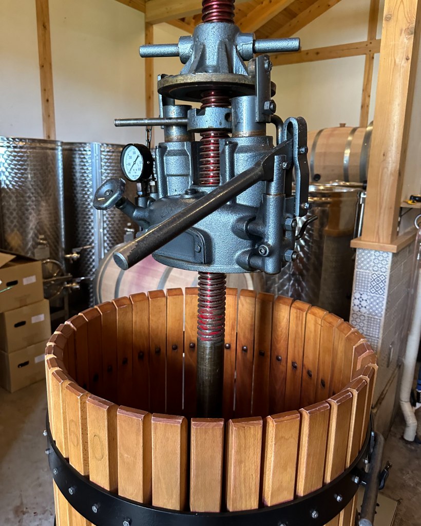 セラー内部は、非常にコンパクトで、小型のステンレスタンクとバリックが並んでいますが、まず目に入るのが、木製のバスケット・プレス(圧搾)機です。
