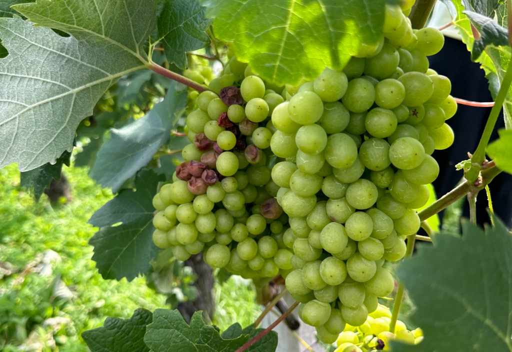 写真のようにミルランタージュ(結実不良)かと思うような小粒の果実が混ざっています。当地での栽培は結構難しく、糖度や酸がなかなか上がらないうえに、落果も多いようです。