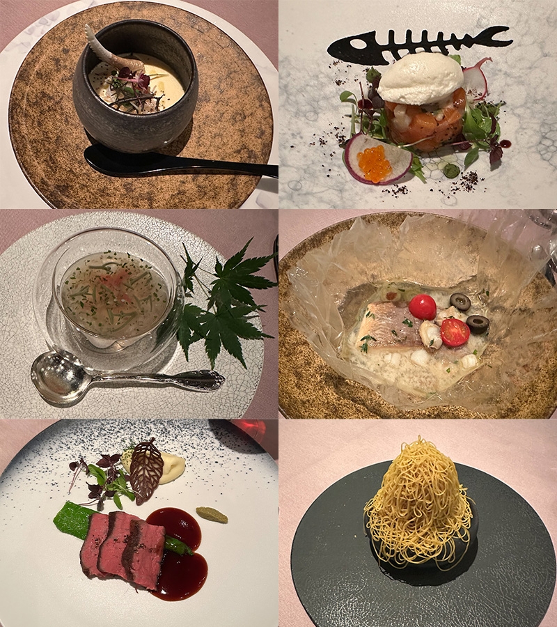 夜は、ホテルのレストラン「シャモニー」にて、お楽しみのフレンチディナーです。シェフの永妻信人さんの素晴らしい創作フレンチが堪能できました。