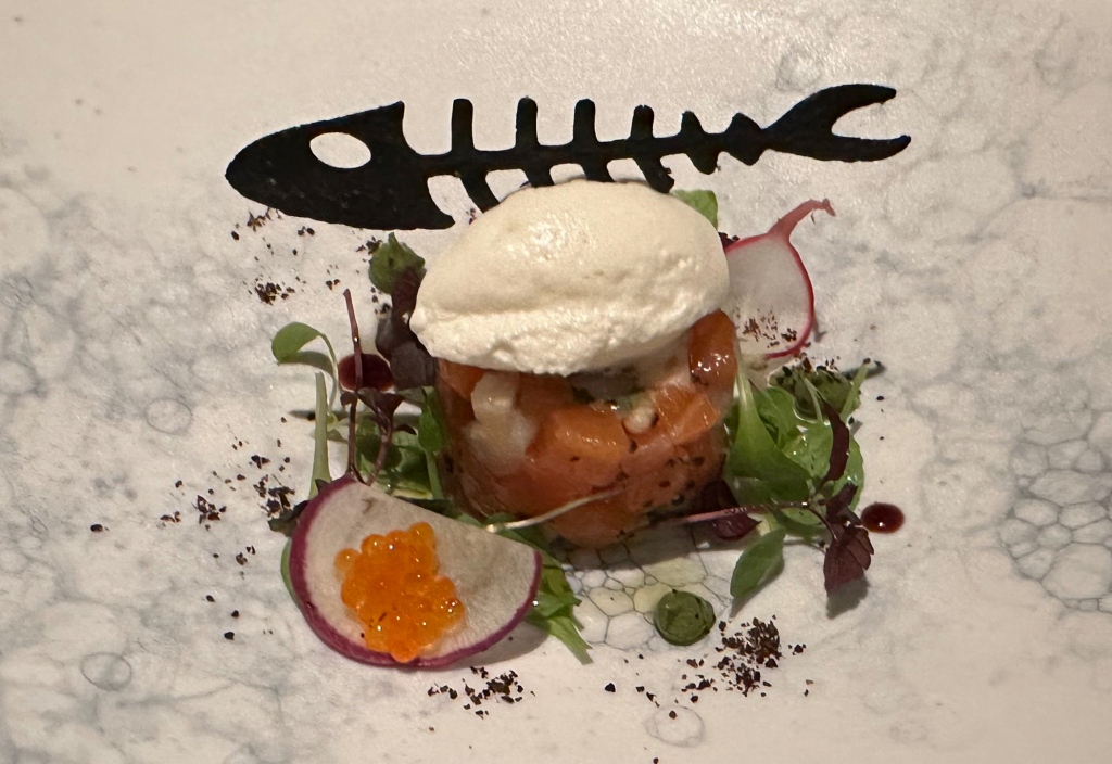 ↓前菜の「湧水で育った大出信州サーモンのガトー仕立てクロモジの燻製クリームとお魚チュイル」