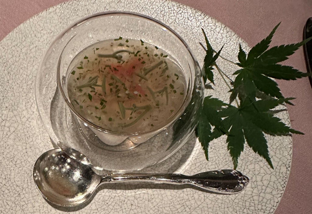 ↓ジュンサイとつぶ貝とクリアなトマト水の冷製スープ