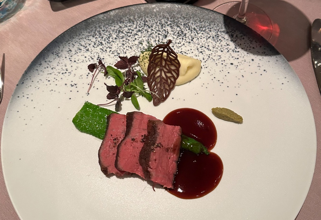 ↓メインの肉料理は、「国産牛ロースの炙り焼き 塩尻五一わいんソース」です。