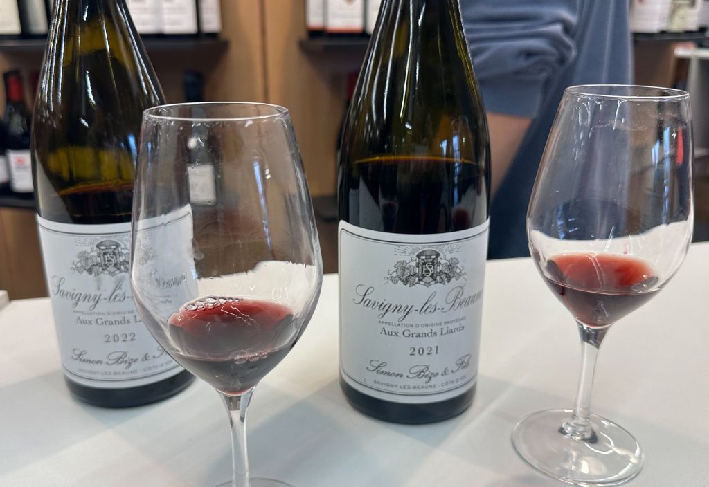 ↓シモン・ビーズのサヴィニー・レ・ボーヌ・オー・グラン・リアールです。過去によくお世話になりました。こちらは2021年(右)と2022年(左)です。今回唯一、ヴィンテージ違いを試せました。色合いにも結構違いが出ていますが、2021年は淡く、冷涼でエレガント、2022年は、果実味たっぷり、ここのこのワインとしては、結構濃いです。