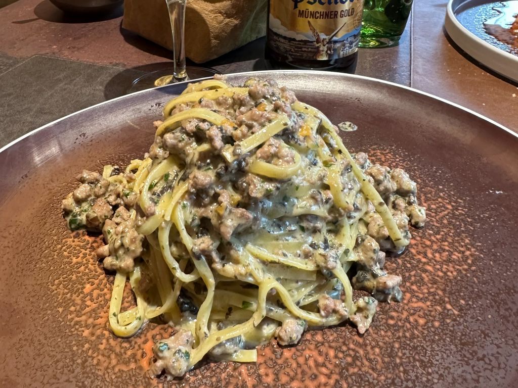 店のお薦めの黒トリュフフ入りのクリームパスタです。友人は、トマトのパスタをオーダーしました。長旅の疲れと寝不足が吹き飛ぶ美味しさです。