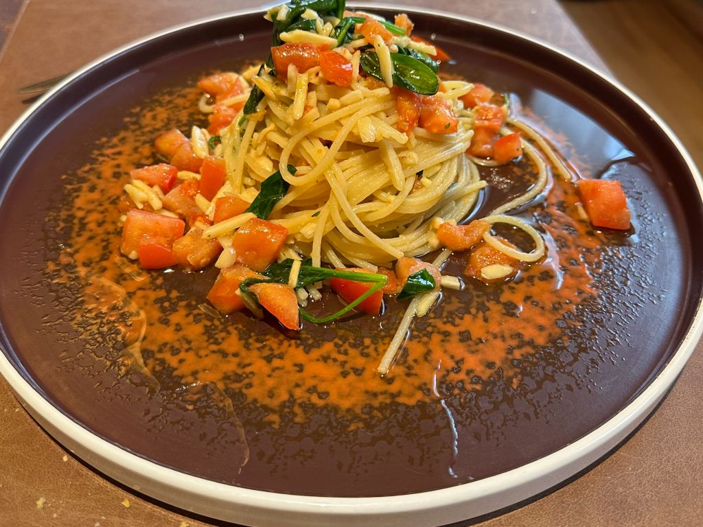 初日は12時前に着いたので、昼食は、街のレストランに出向きました。いろいろ探した挙句、ピザ店と迷った末に、パスタの店に。