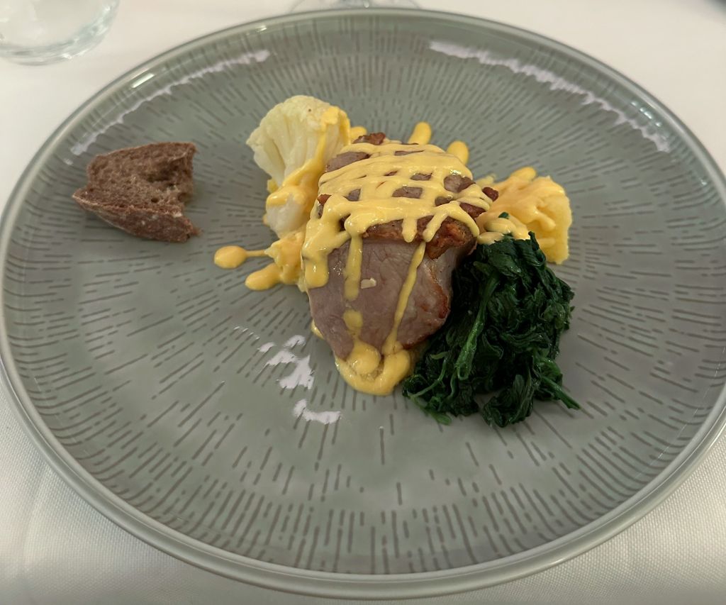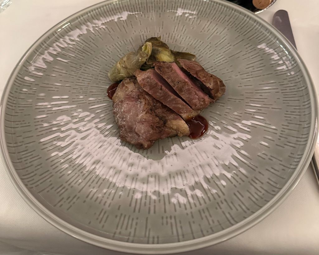 5日目は、イベリコ豚のグリル。メニューには”Grilled iberian white pluma <pork cooked rare>”とあります。plumaの意味が気になり、後で調べたところ、イベリコ豚の肩ロースの後方部にある三角形状の希少部位のようです。rareとありますが、低温調理と思われます。