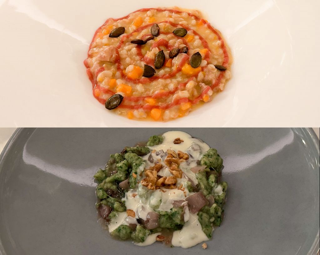 パンプキンと赤カブの大麦クリームリゾットとグリーンシュペッツレ(パスタの一種)に赤チコリとチーズフォンデュ、クルミ添え。