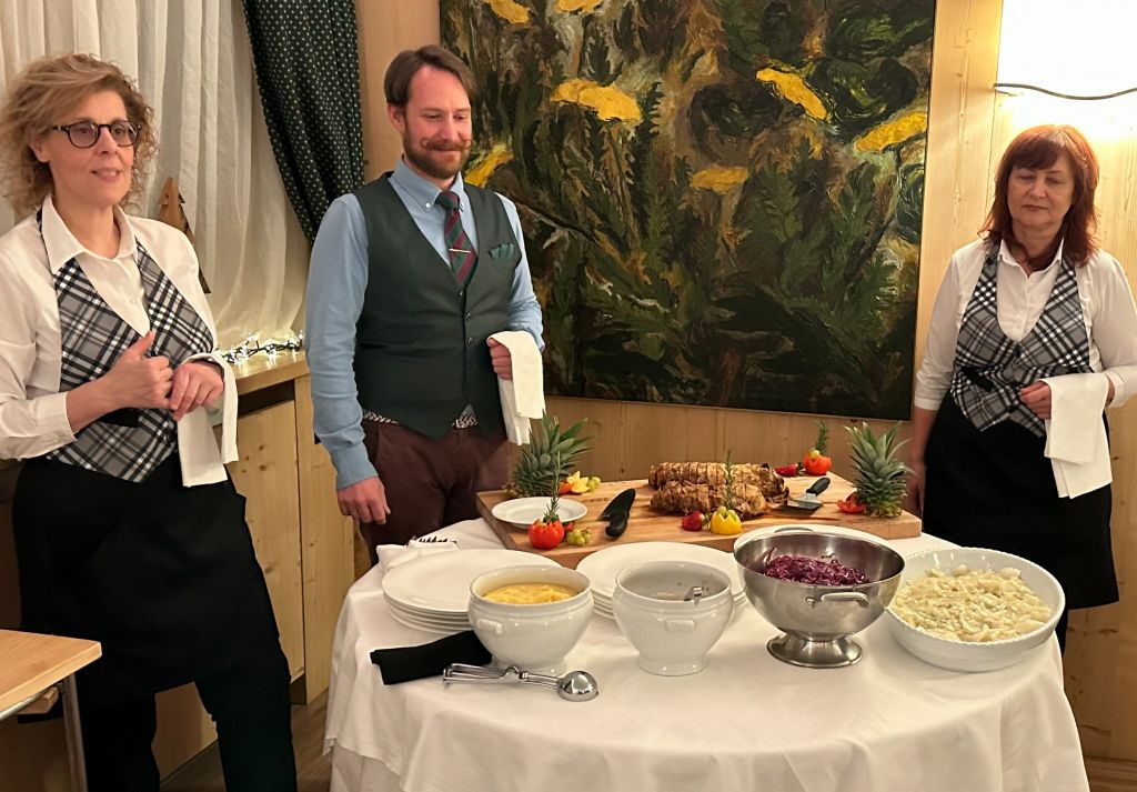 この日は、本ツアーのスペシャルコースということで、オーナー一家自ら取り分けてくれました。右端の方がオーナーのサンドラさん、中央がワインのサーブをしていただいたロニーさんです。とてもフレンドリーなスタッフでした。