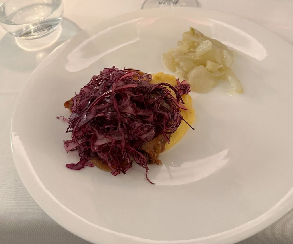 赤キャベツに隠れていますが、子牛のロース肉のグリルです。とても柔らかい肉でした。下の黄色いペーストは、ヴェネト名物のトウモロコシ粉を使った「ポレンタ」です。