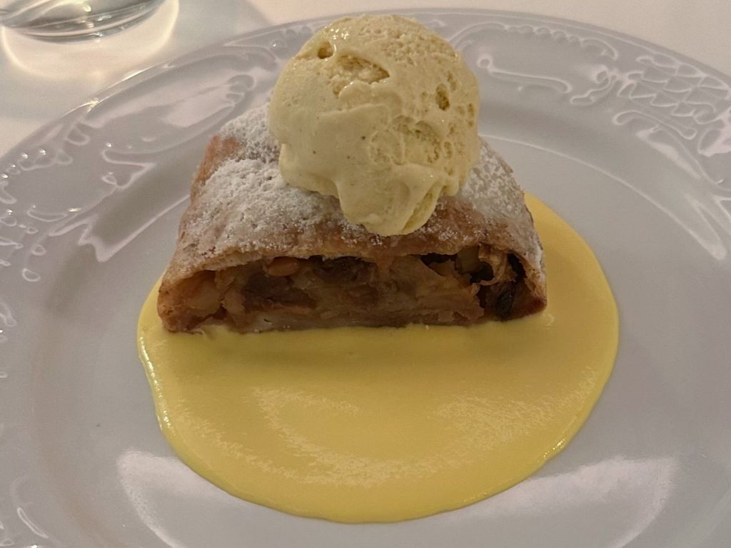 ↓この日のデザート。アップル シュトゥルーデルの上にバニラアイスが乗っています。