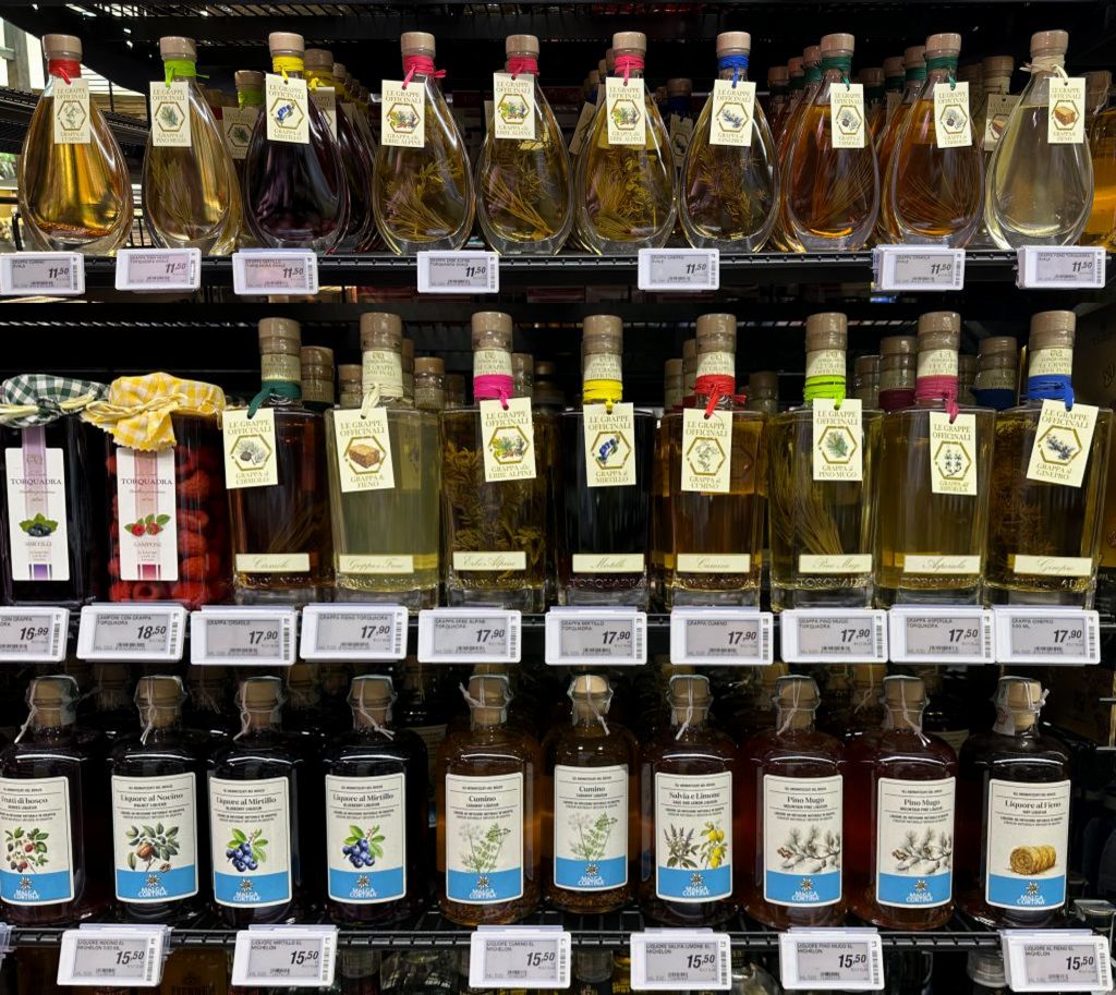 ただ、スーパ(生協)の売り場には多数のグラッパが並んでいました。もちろん、通常の無色透明のグラッパや樽熟成した琥珀色のレゼルヴ(結構高い)もありますが、目を惹いたのが様々な植物や果実を漬け込んだグラッパです