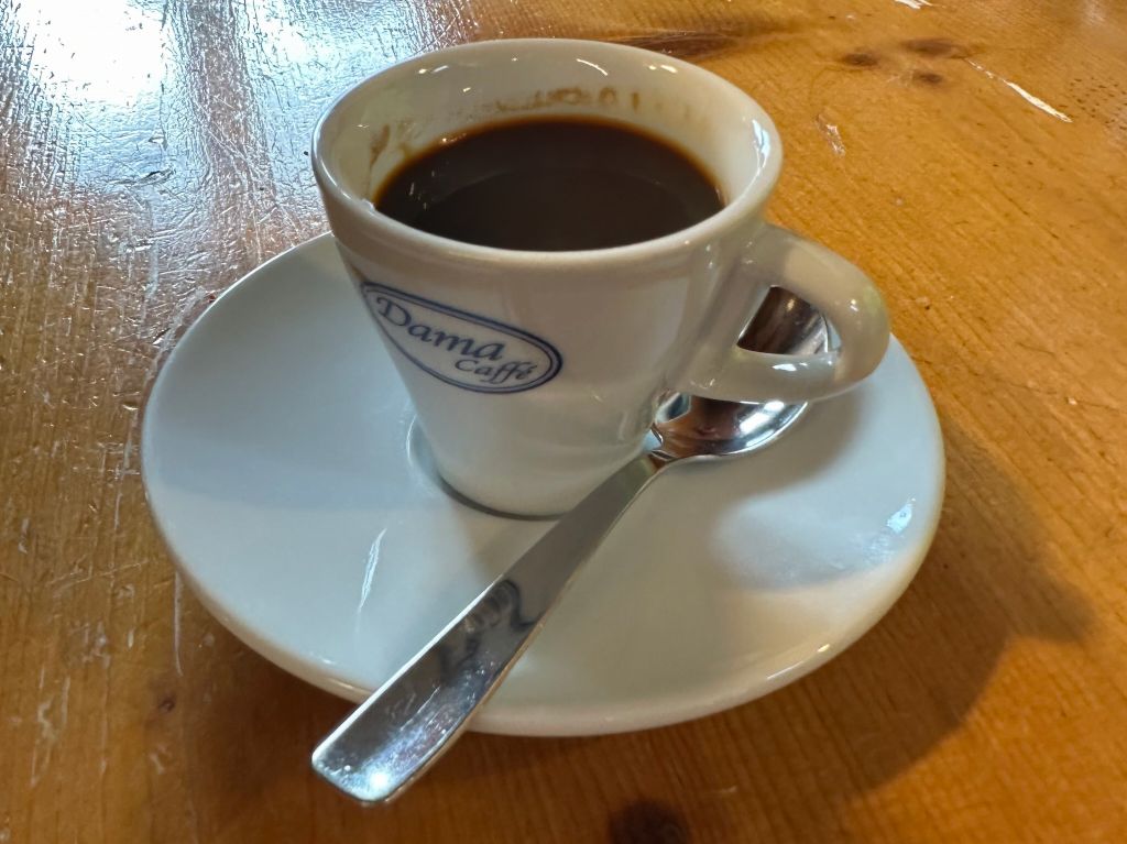 「カフェ・コレット」、グラッパ入りのエスプレッソです。発音が悪かったのか通じませんでしたが、”Espresso with grappa”でなんとか通じました。