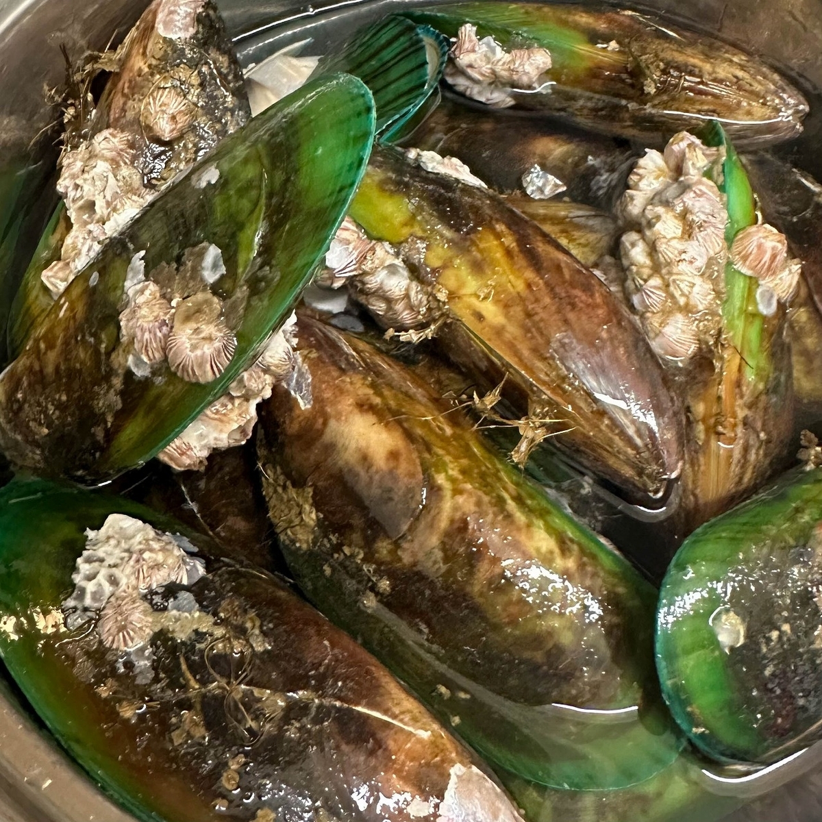 ↓ここで発見したのが緑色のムール貝。ニュージーランドで養殖されているグリーン・マッスル(Green lipped mussels)というムール貝のようです。