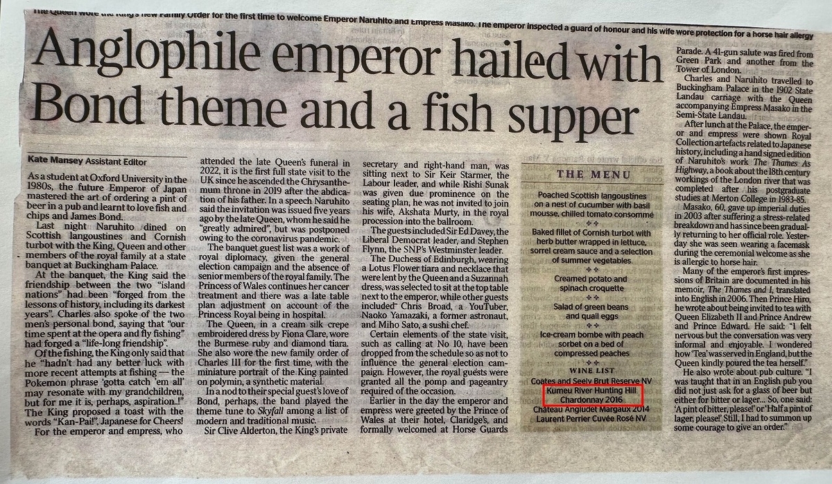 かつて皇太子(現天皇陛下)がイギリスを訪問した際に晩餐会で提供されたワインのひとつが、ハンティング・ヒル・シャルドネ2016だったとのこと。