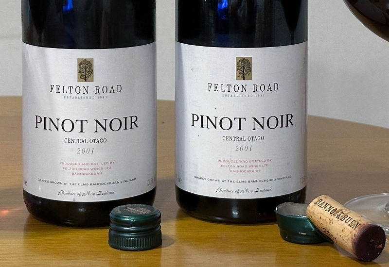 とはいえ、スクリューキャップのワインを20年以上熟成させるとどのように変化するのかというのは、とても興味がありました。今回、幸いにもコルクとスクリューで長期熟成させたニュージーランドのピノノワールの同一のワインを入手できたので、同時に抜栓して比較してみることにしました。