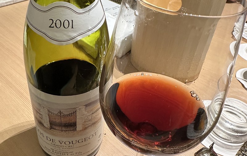 ↓ちなみに、下の写真は、直近(2ヶ月前)に飲んだ、ブルゴーニュ グラン・クリュ(ジャン・ラフェク)の2001年です。産地もヴィンテージの気候も全く違うので、比較すること自体は全く無意味なのですが、まだ歴史の浅い時代のニュージーランドのワインなので、このしっかりとした色合いは、ちょっと驚きでした。